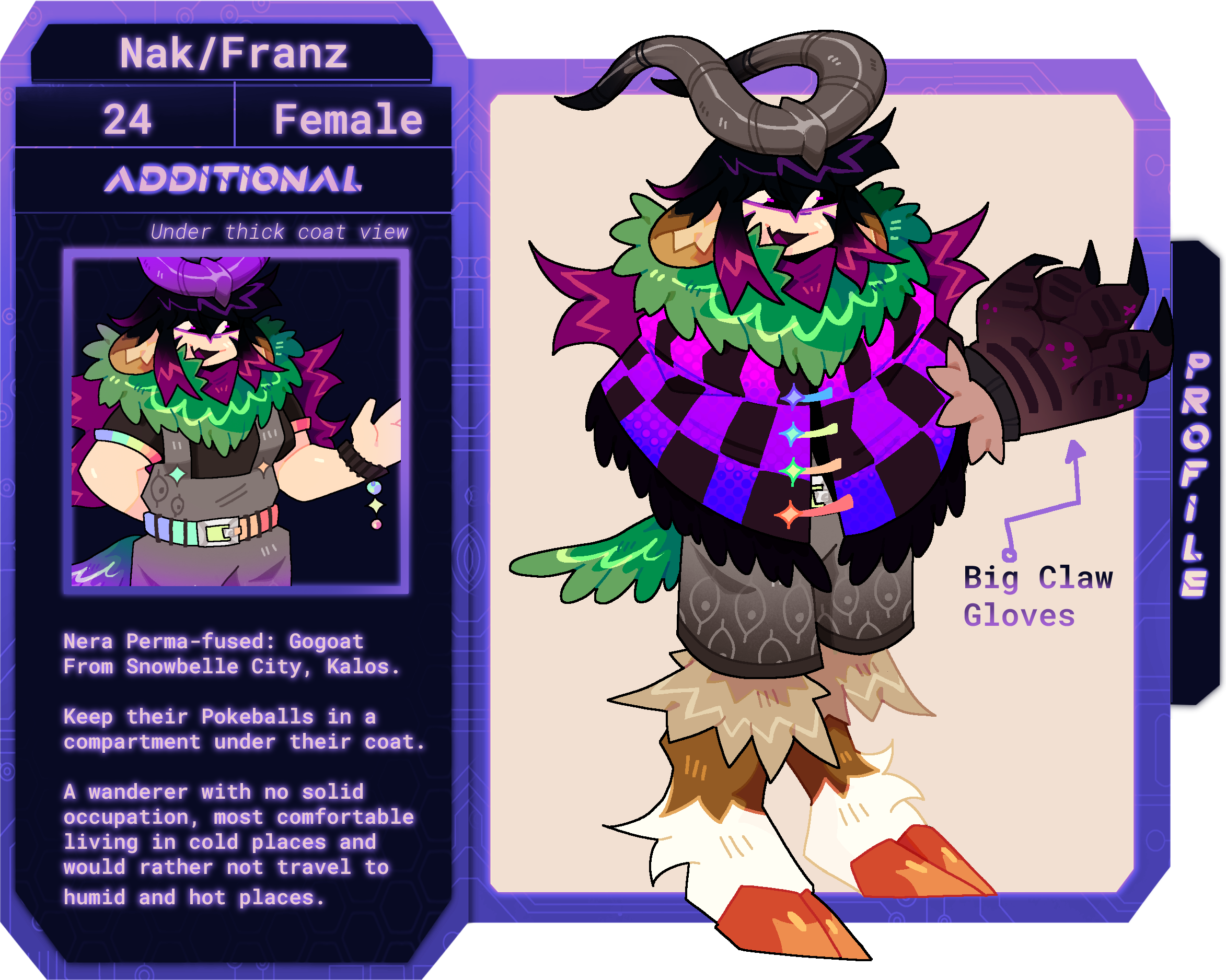 Franz was surprised by the horns and grassy mane they grew soon after being infused but accept their new addition relatively well and soon become perma-fused while their friend could not accept the new wings and feather as a result of the Nera, so one final argument broke out on why Franz doesn't want to seek suppression tech (or trust any new tech) cause the two of them to go their separate way. Now Nak wander Reigns Rest, doing the odd jobs and battling trainers to get by until the place is right and they can settle back down again. Wintervale seem close enough to make their home right?