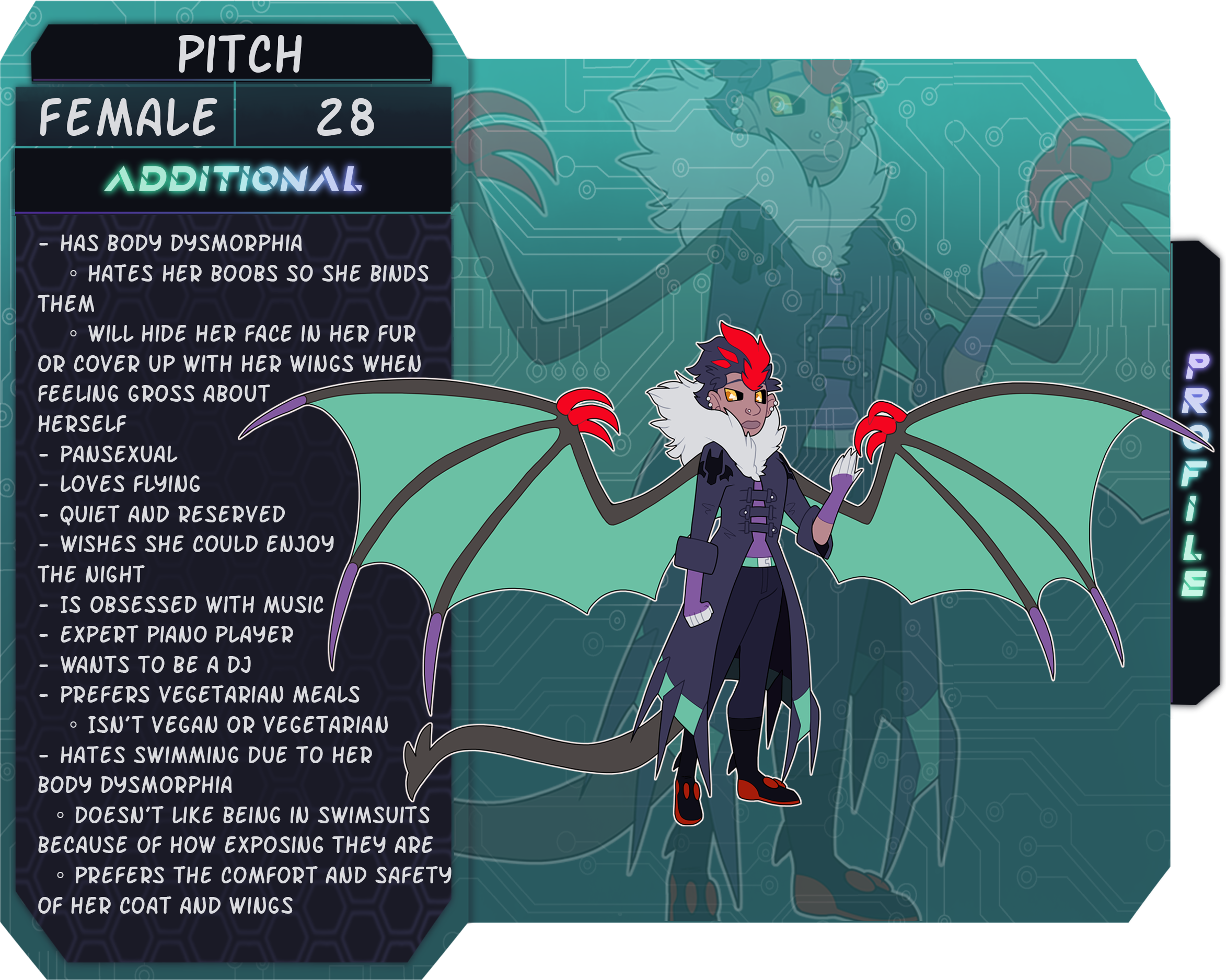 She suffers massively now from her body dysmorphia and does everything to hide herself be it through her coat or from closing her wings around herself. She hates a lot about who she is and blames a lot of what happened to her parents on the fact that she was a coward and hid rather than fought beside them. Maybe then… if she had done that… she would still be with them be it in life... Or death.