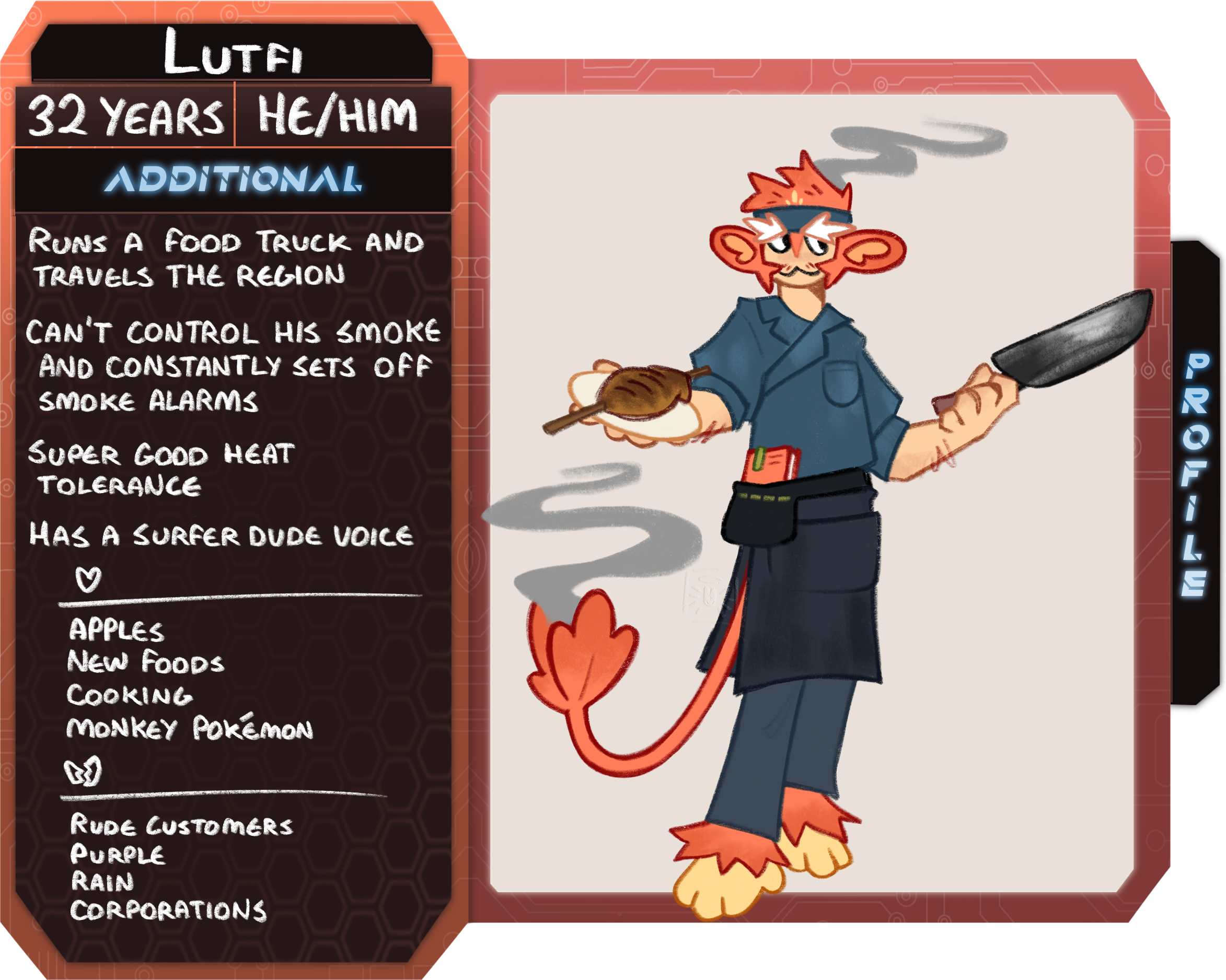 Born and raised in Alola, Lutfi was the middle child in a big family. With lots of siblings and cousins, all set on what they wanted to do when they grew up, Lutfi had lots of examples and ideas to follow. Yet he struggled with finding something he loved. Until he met a wise Pignite, who introduced him to the joys of cooking. He loved trying new recipes, and putting a smile on people's faces when they had a good meal, and when he heard his uncle came to visit and offered to take Lutfi under his wing and take him to his food truck in Reignsrest, he grabbed that hand and left Alola.